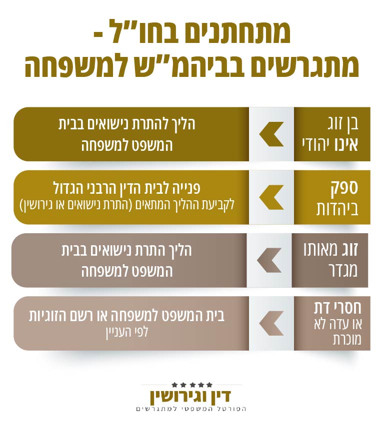 - אם אחד מבני הזוג אינו יהודי, הרי שעל בני הזוג המעוניינים להתגרש, לפנות לביהמ"ש למשפחה ולנהל "הליך להתרת נישואים". לשם כך יש להגיש תביעה לביהמ"ש, לצרף אסמכתאות ולהמתין לקבלת פס"ד המתיר להם את הנישואים.